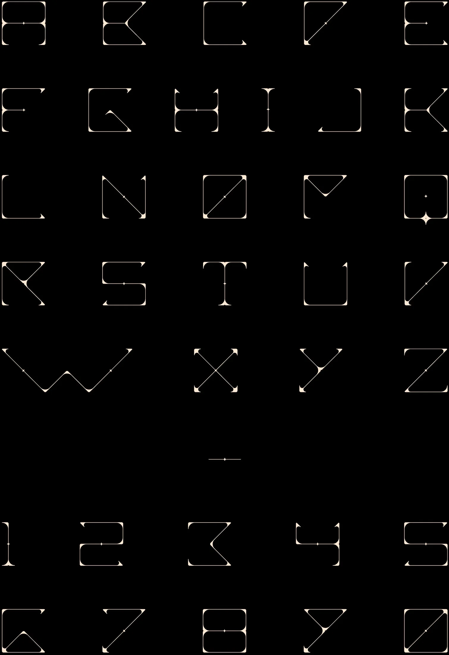 The specialty of this font is both it’s visual display and through its assembly. Each letter is created through a “lotus” design that has the joints for each letter, then connected with line segments to form the letters.